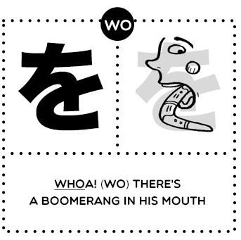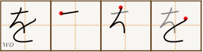 Walaupun huruf を dieja sebagai ‘wo’ namun sebutannya menghampiri huruf ‘o’ tetapi sebutannya lembut berbanding huruf お (o). Huruf ini digunakan sebagai kata sendi.